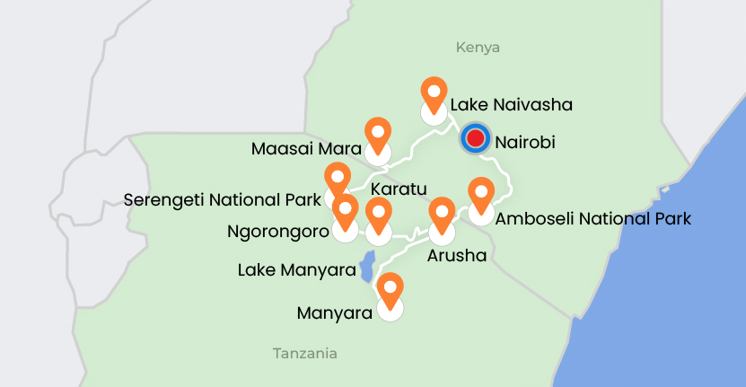 This exciting African safari begins in Kolkata, flying to Nairobi before heading to the scenic Lake Naivasha in the Great Rift Valley. The journey continues to the wildlife-rich Maasai Mara National Reserve, then crosses into Tanzania to explore the vast Serengeti National Park and the spectacular Ngorongoro Crater via Karatu. The adventure proceeds to Lake Manyara National Park, then via Arusha to Amboseli National Park, famous for views of Mount Kilimanjaro. The tour concludes with a return to Nairobi and the flight back to Kolkata.